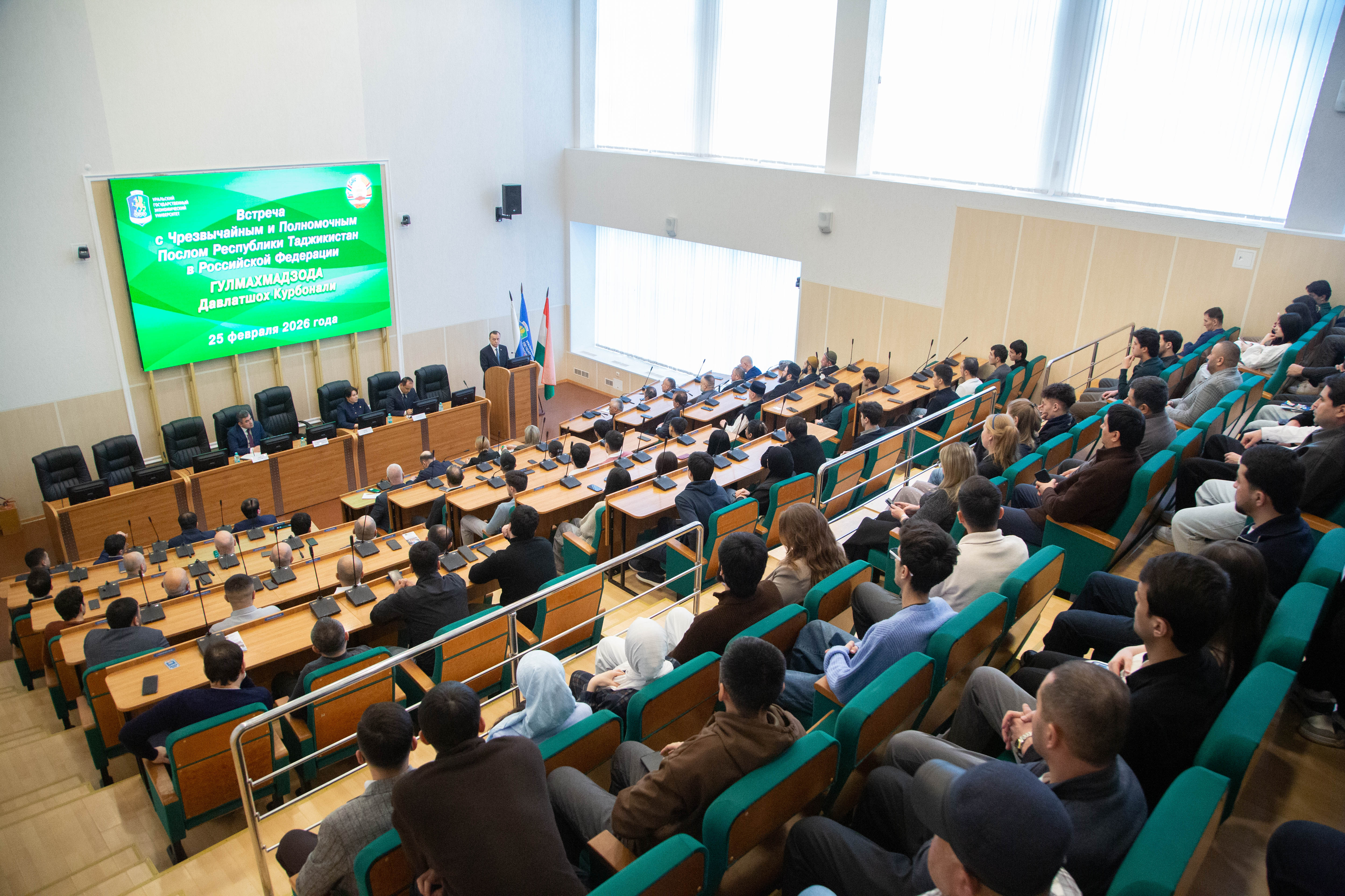 出席会议的有USUE社会工作和青年政策副校长Roman Krasnov、塔吉克斯坦共和国驻叶卡捷琳堡总领事Kholnazar Goib、大使馆二等秘书Fatkhullobek Aslamov、大使馆二等秘书Behruz Jamshedzoda和塔吉克斯坦共和国劳动、移民和就业部驻俄罗斯联邦代表处主任Dilrabo Azimi。